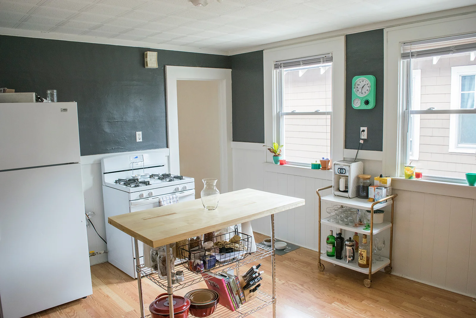 I still have this island today, though no future apartment was as large as this one. I’ve cut down the wood block so it’s much smaller and is the exact size of the shelves now without an overhang. I love that it’s so easy to disassemble and move.